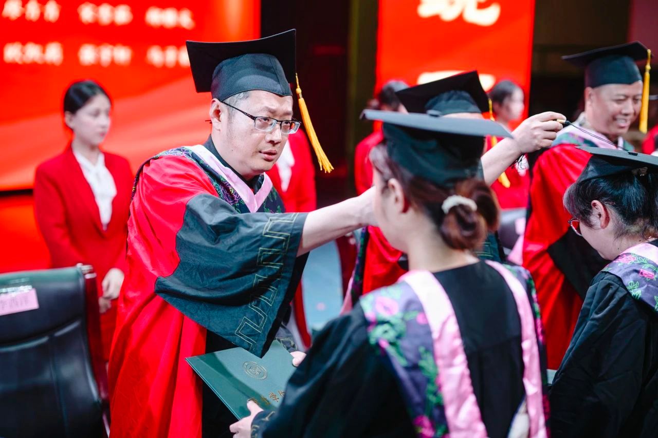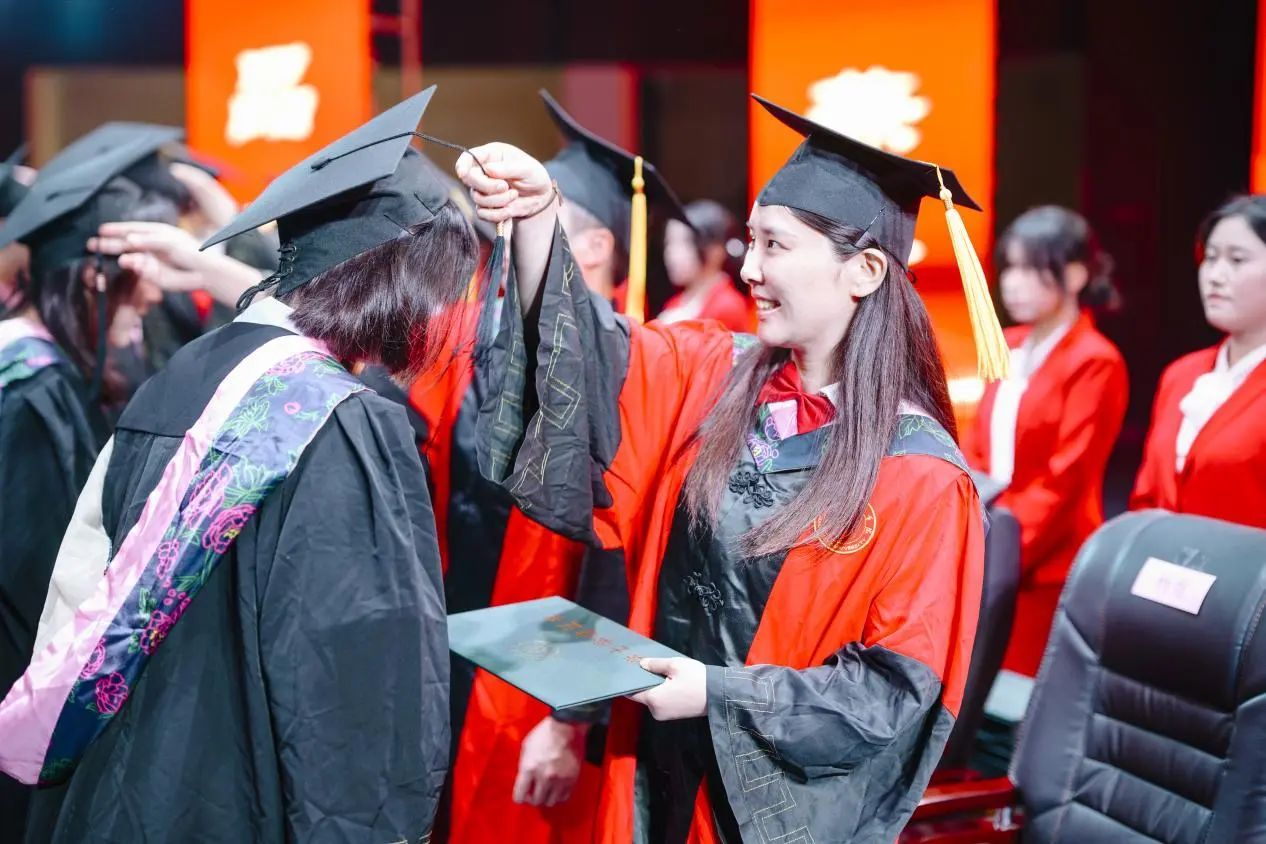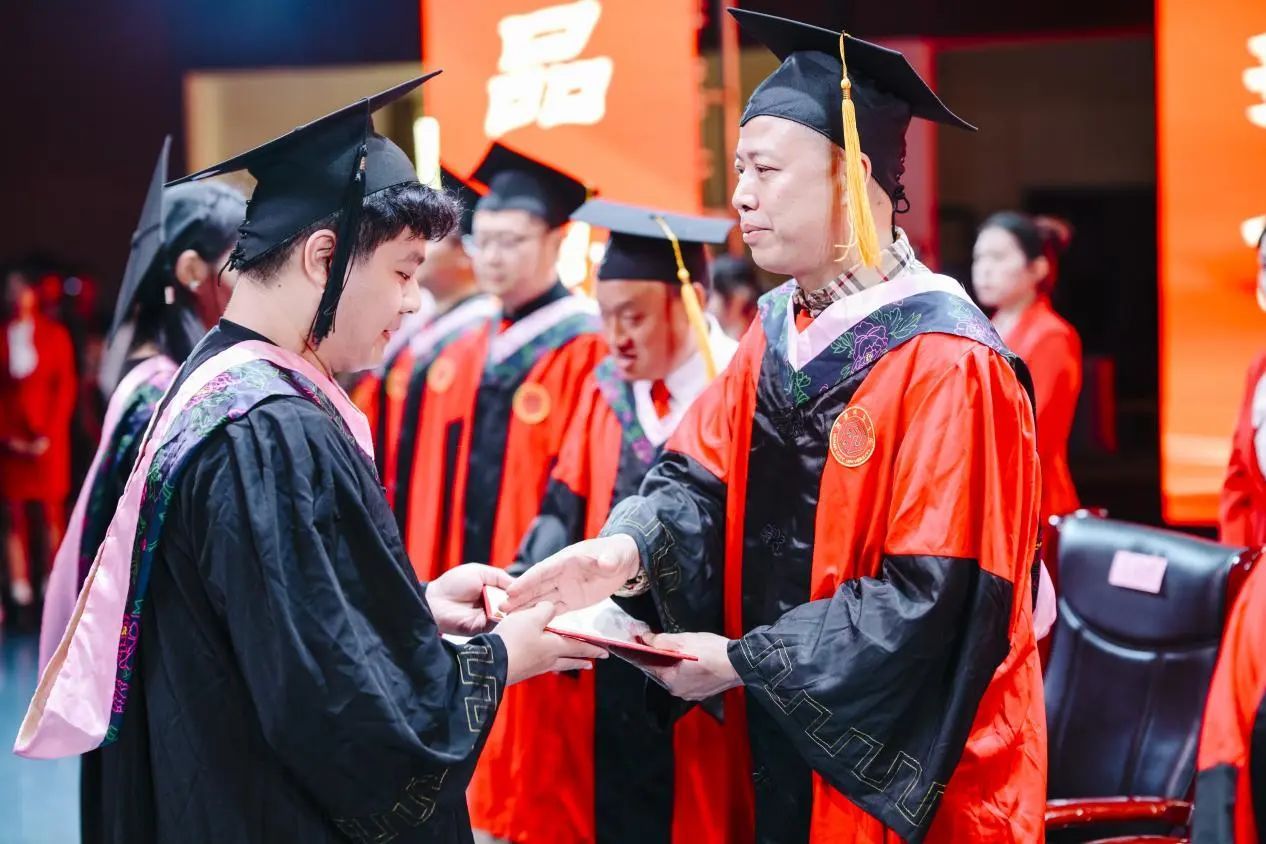 活动尾声,龚力副经理宣读学位授予决定和毕业作品获奖名单后,钟正武、谷利民等十位导师为毕业生逐一拨穗。