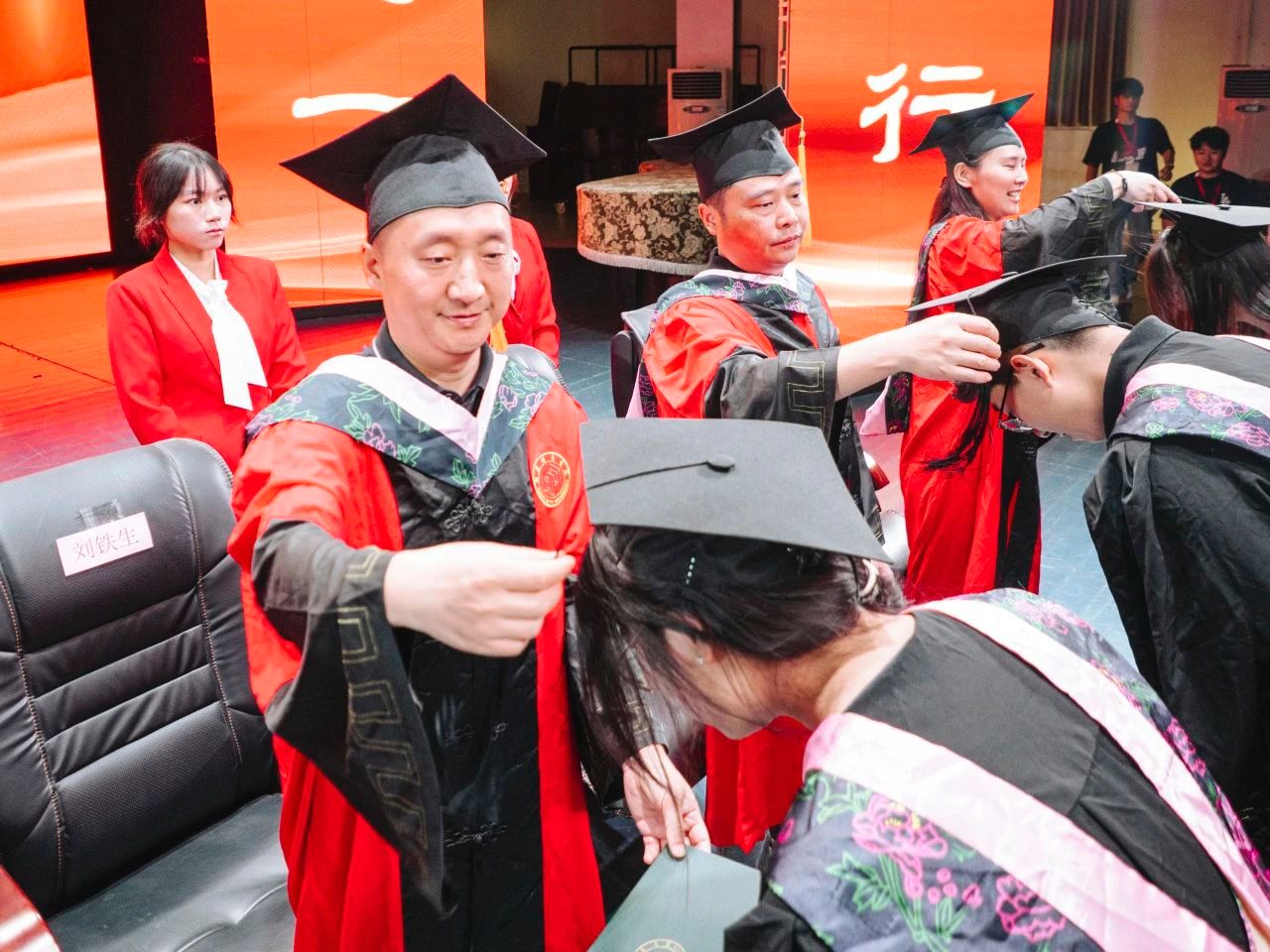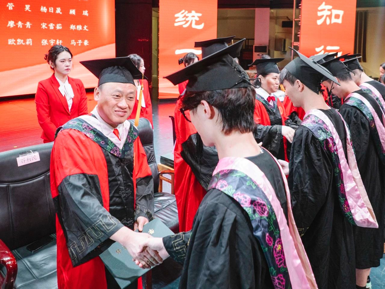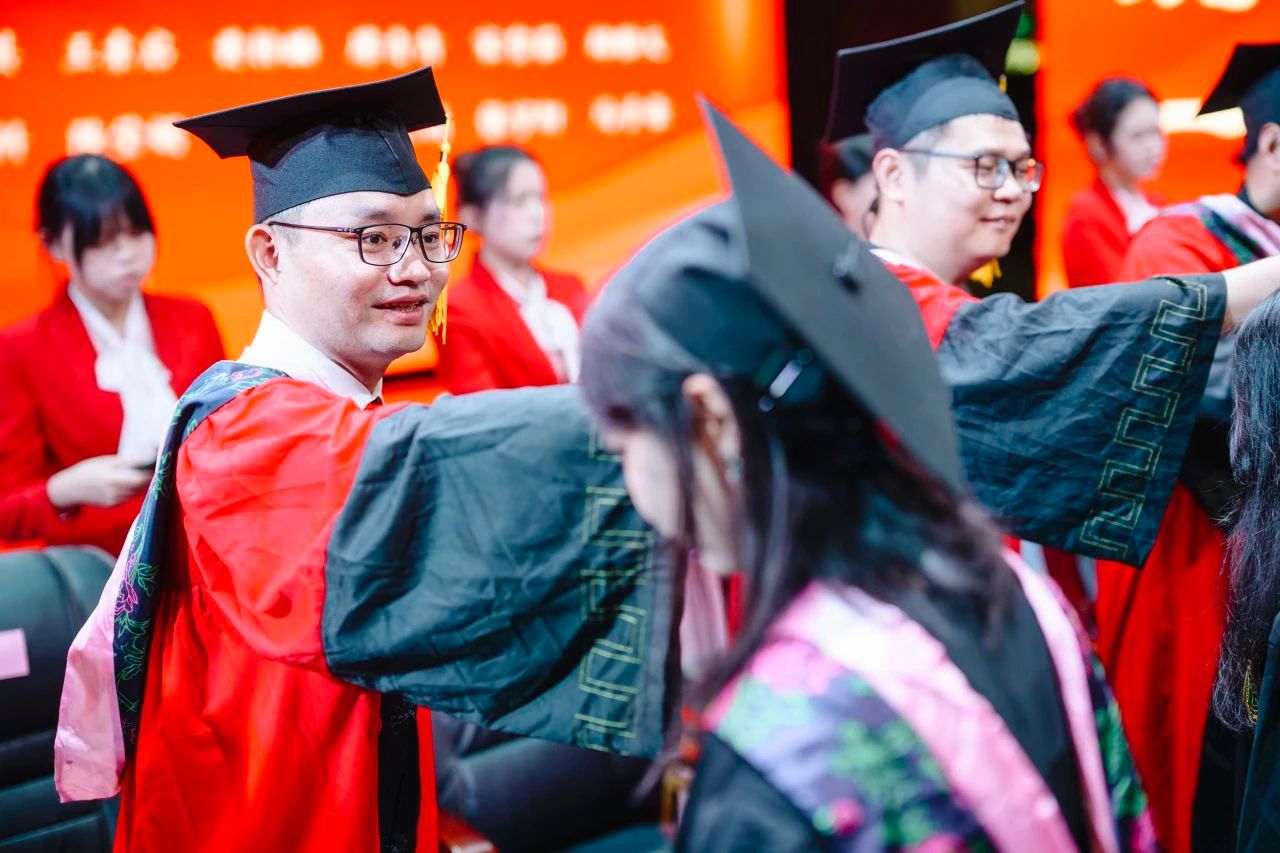 活动尾声,龚力副经理宣读学位授予决定和毕业作品获奖名单后,钟正武、谷利民等十位导师为毕业生逐一拨穗。