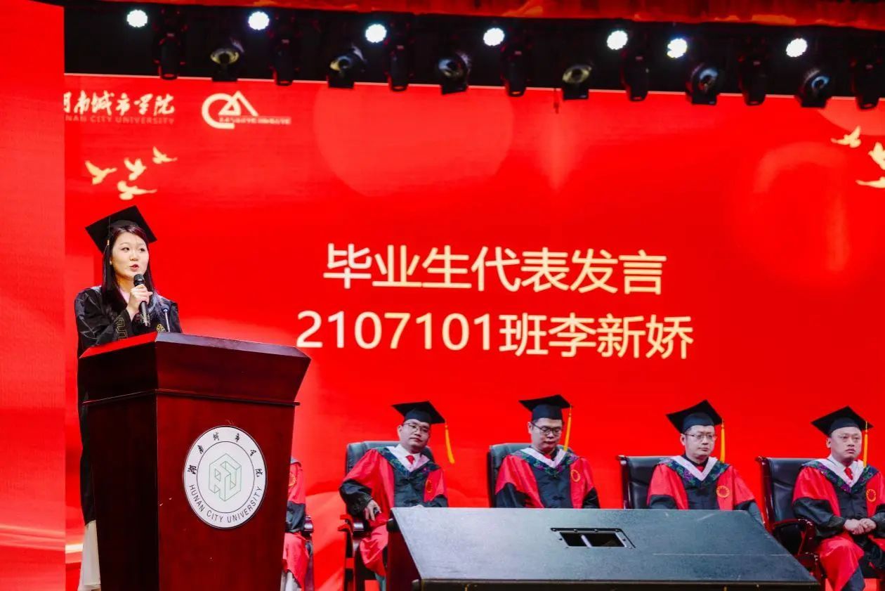 紧接着,优秀毕业生代表李新娇走上讲台发言,她不仅分享了在校学习生活的难忘经历、成长感悟,以及对未来的憧憬与规划,还以真挚的话语、深刻的体会,引起了在场毕业生们的强烈共鸣,也让大家感受到了榜样的力量。