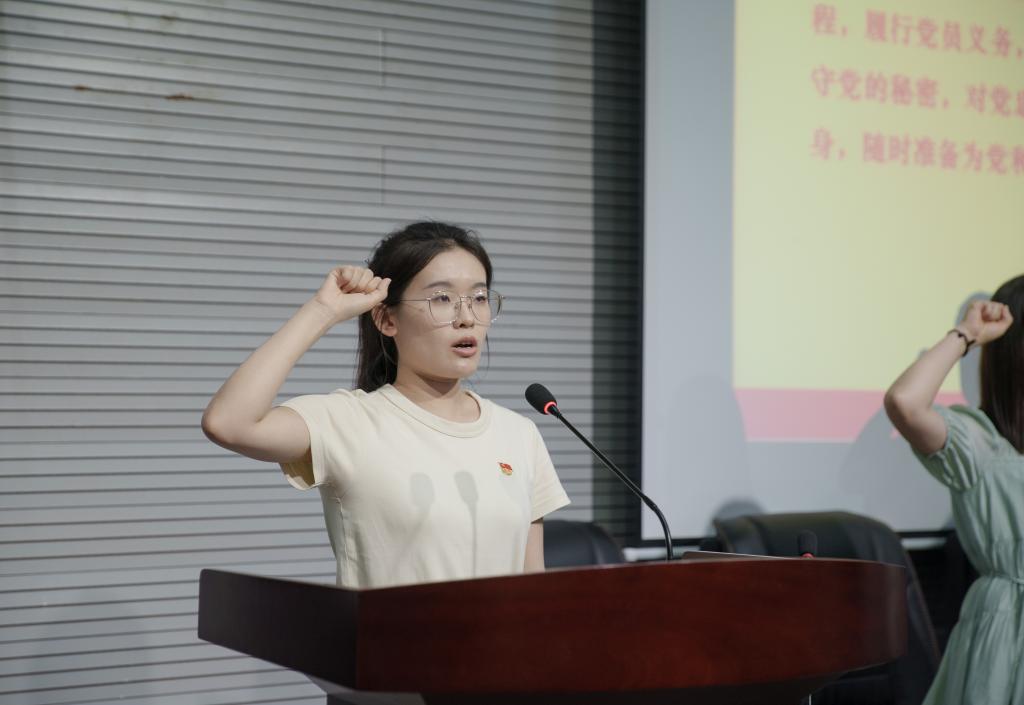 会议伊始,全体参会人员起立,面向党旗,共同重温庄严而神圣的入党誓词。