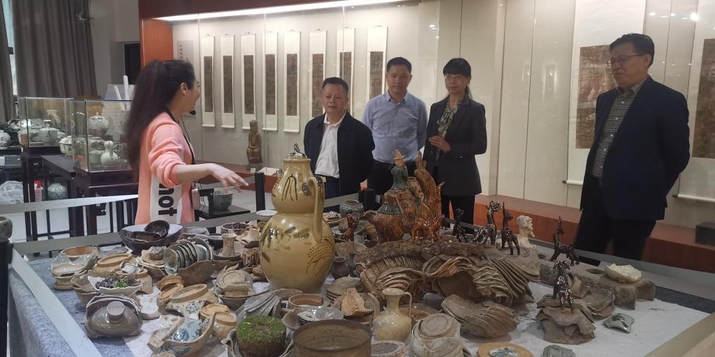 羊舞岭窑陶瓷艺术研究发展有限公司监事、羊舞岭窑陶瓷技艺传承人文婕老师为贺修铭一行认真讲解了羊舞岭窑的发展历史及其历史价值,并对陶瓷作品一一进行讲解。随后,大家又参观了羊舞岭窑现代艺术作品展。