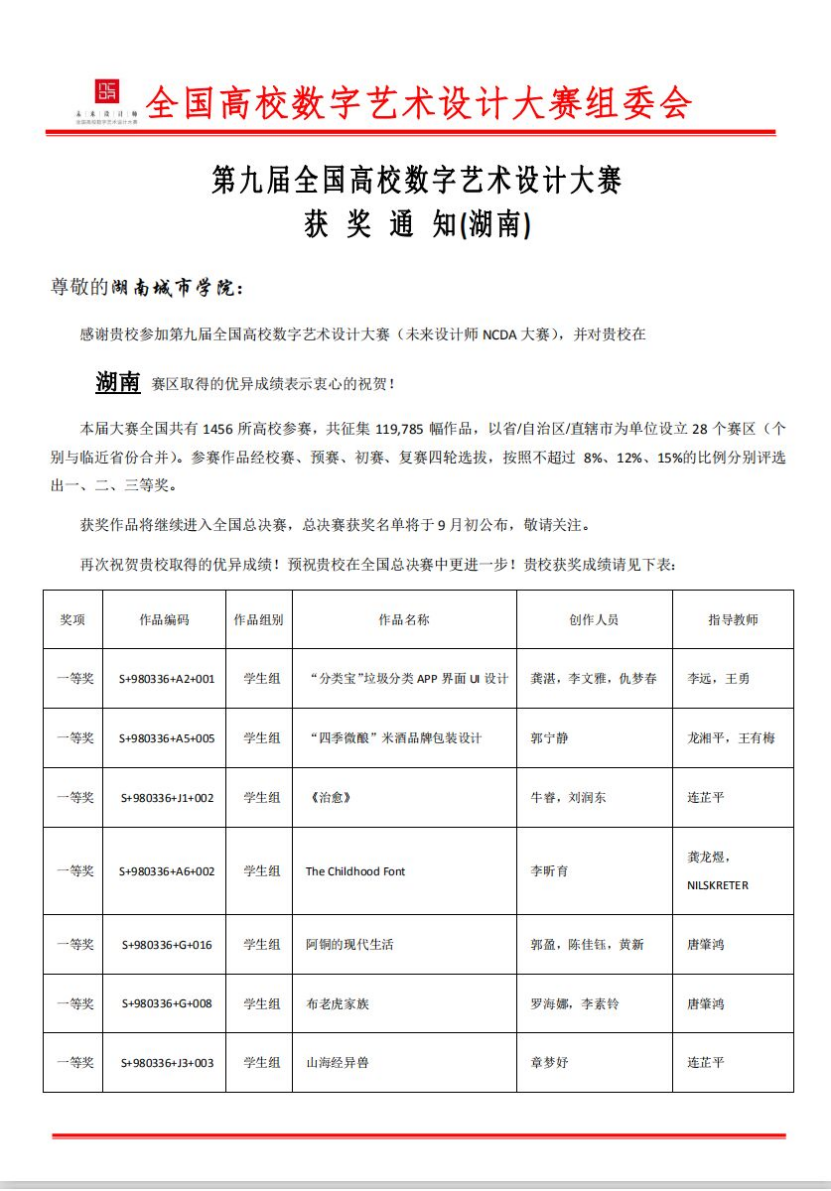 第九届全国高校数学艺术设计大赛湖南赛区评审工作近日落下帷幕。公司艺术公司和国际教育公司选送的作品在此次比赛中获得湖南赛区一等奖7项、二等奖16项、三等奖26项。(具体获奖附表)。